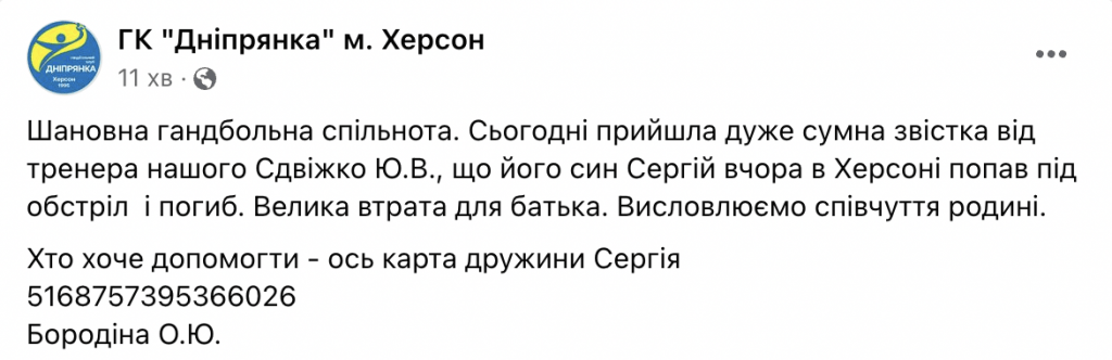 Вчора під час обстрілів Херсона загинув син тренера з гандболу Юрія Сдвіжка.