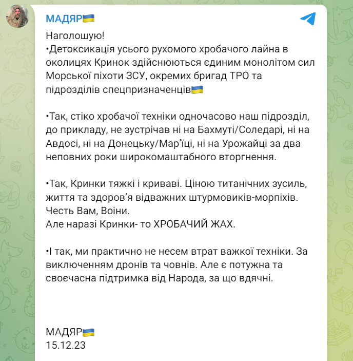 - "Детоксикація усього рухомого хробачого лайна в околицях Кринок здійснюються єдиним монолітом сил Морської піхоти ЗСУ, окремих бригад ТРО та підрозділів спецпризначенців", ― написав Мадяр.