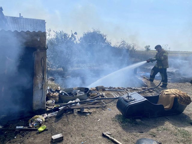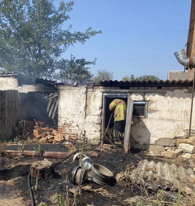 Майже одразу надійшов другий виклик про пожежу у с. Миколаївка. Через ворожий приліт загорілись господарчі споруди та суха трава.