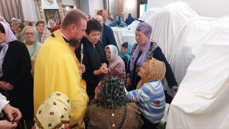 На фото зверху: Віряни під час ворожого обстрілу в храмі Різдва Богородиці. Херсон, 08.10.2023 р. Фото: соцмережі.
