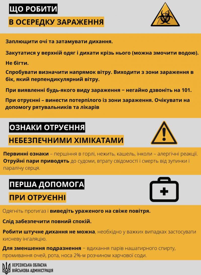 У свою чергу, Херсонська ОВА опублікувала рекомендації і детальний алгоритм дій у разі хімічної небезпеки на інфографіці.