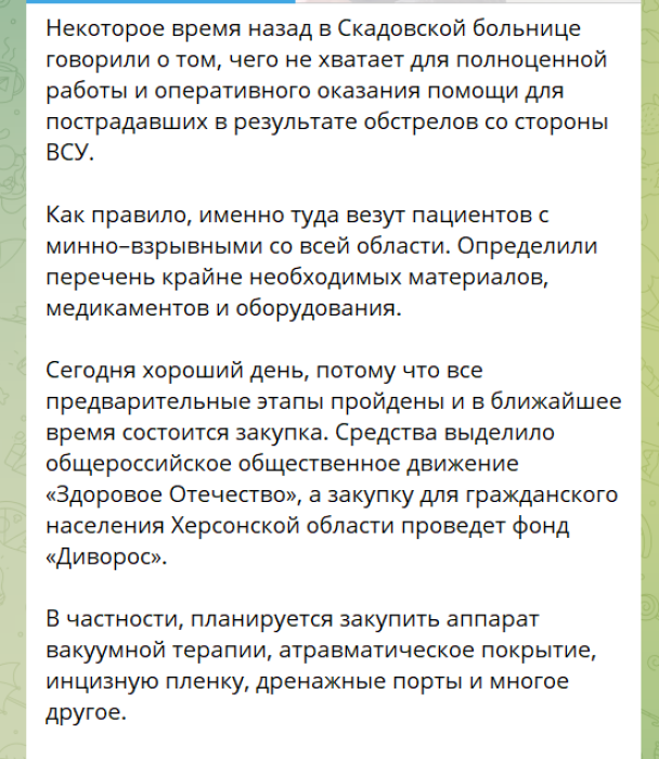 Після обстрілу ринку у Великих Копанях на Херсонщині кількість постраждалих за повідомленнями окупантів — 14 осіб: шестеро загинули та вісім — поранені. Втім, лікувати поранених немає чим.Це зокрема підтвердив і окупаційний «сенатор від Херсонської області» Ігорь Кастюкевич. Росіяни лише зараз визначили перелік необхідних препаратів та обладнання, необхідних для скадовської лікарні.