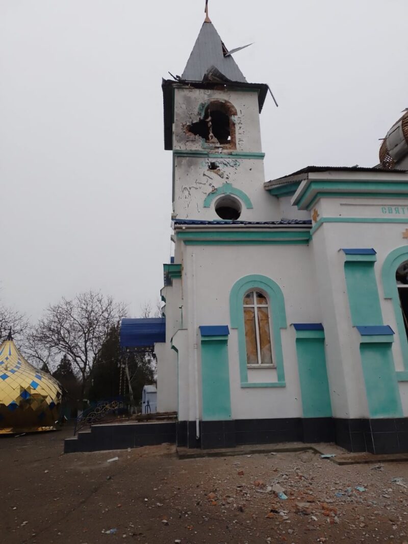 Храм зазнав подальших пошкоджень, цього разу снаряди вцілили у дзвіницю”, – повідомив він на своїй сторінці в соцмережі.