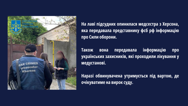 Статус обвинуваченої за вчинення держзради отримала медсестра однієї з лікарень міста Херсон (ч. 2 ст. 111 КК України). Після звільнення від окупантів обласного центру жінка продовжила підтримувати контакт з представником фсб рф, якому передавала дані українських захисників, що лікувалися в медичній установі, а також відомості про дислокацію, озброєння та переміщення військової техніки підрозділів ЗСУ та інших сил оборони.