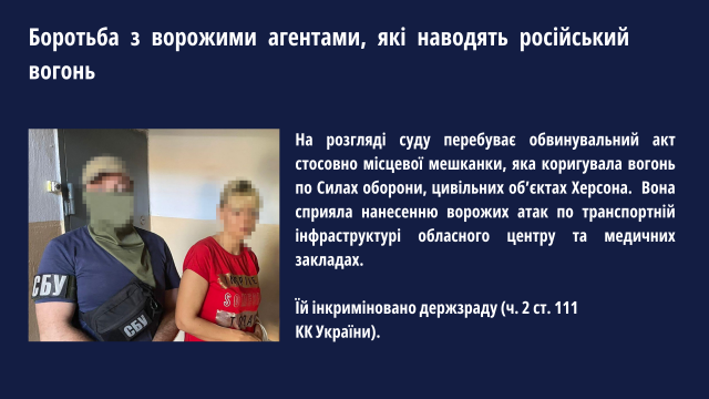 На розгляді суду перебуває обвинувальний акт стосовно місцевої мешканки, яка коригувала вогонь по Силах оборони, цивільних об’єктах Херсона. Вона сприяла нанесенню ворожих атак по транспортній інфраструктурі обласного центру та медичних закладах. Їй інкриміновано держзраду (ч. 2 ст. 111 КК України).