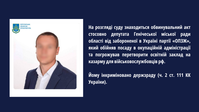 На розгляді суду знаходиться обвинувальний акт стосовно депутата Генічеської міської ради області від забороненої в Україні партії «ОПЗЖ», який обійняв посаду в окупаційній адміністрації та погрожував перетворити освітній заклад на казарму для військовослужбовців рф. Йому інкриміновано держзраду (ч. 2 ст. 111 КК України).