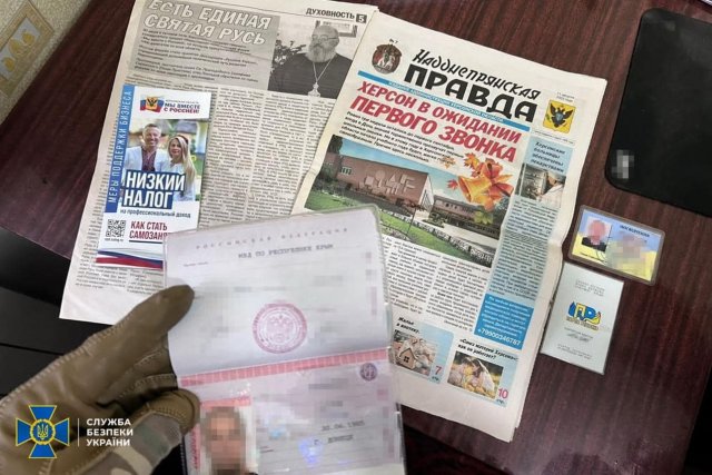 пропагандистську символіку країни-агресора та інші речові докази незаконної діяльності.Наразі на підставі зібраних Службою безпеки документів затриманому повідомлено про підозру за двома статтями Кримінального кодексу України: