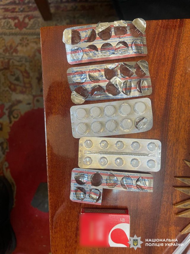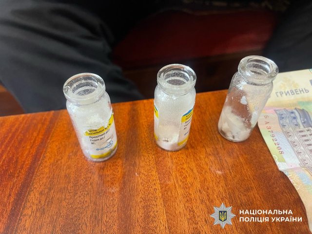 Правоохоронці вилучили гроші, отримані від злочинної діяльності, порожні та заповнені блістери пігулок «Метафін», три скляні ємності з невідомою розсипчастою речовиною та мобільний телефон із SIM-карткою.