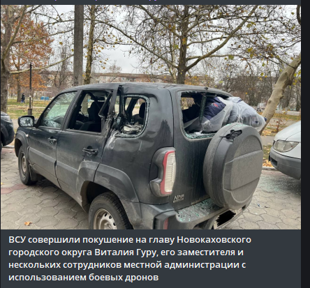 “Безпілотник, керований українськими військовими, націлився на авто, де знаходилися голова міського округу Віталій Гура та кілька ключових співробітників адміністрації. Також бойовики ЗСУ завдали удару по автомобілю заступника голови Новокаховської адміністрації Новака Максима”, – повідомляють росіяни.