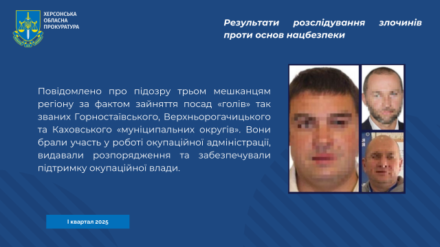 Також трьом мешканцям регіону повідомлено про підозру за фактом зайняття посад «голів» так званих Горностаївського, Верхньорогачицького та Каховського «муніципальних округів». Вони брали участь у роботі окупаційної адміністрації, видавали розпорядження та забезпечували підтримку окупаційної влади.