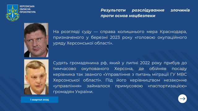Упродовж січня-березня 2025 року до суду направлено низку обвинувальних актів.Херсонський міський суд розглядає обвинувальний акт щодо ексдиректорки ліцею, яка у вересні 2023 року добровільно очолила так звану «Херсонську обласну думу першого скликання».
