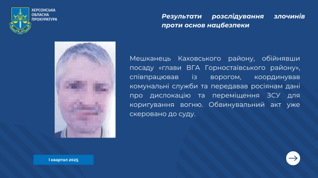 Мешканець Каховського району, обійнявши посаду «глави ВГА Горностаївського району», співпрацював із ворогом, координував комунальні служби та передавав росіянам дані про дислокацію та переміщення ЗСУ для коригування вогню. Обвинувальний акт уже скеровано до суду.
