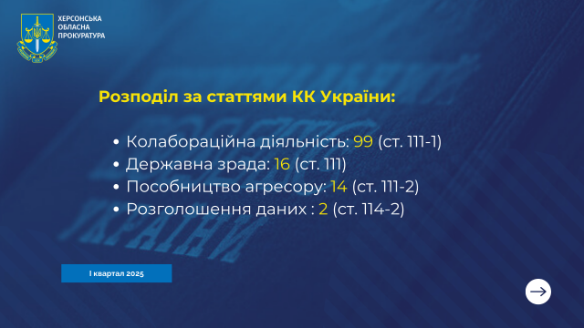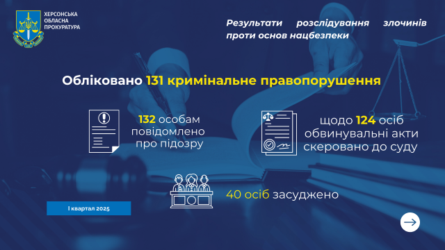 Прокурори продовжують документувати кримінальні правопорушення проти основ національної безпеки України, викритті насамперед зрадників, колаборантів, притягнення їх до відповідальності. Про це звітує пресслужба Херсонської обласної прокуратури.Упродовж І кварталу поточного року на території області обліковано 131 кримінальне правопорушення проти основ національної безпекиУкраїни, вчинених на території Херсонської області:- 99 колабораційна діяльність (ст.