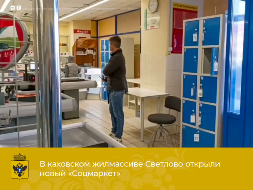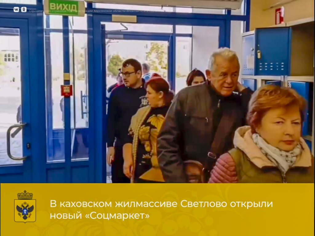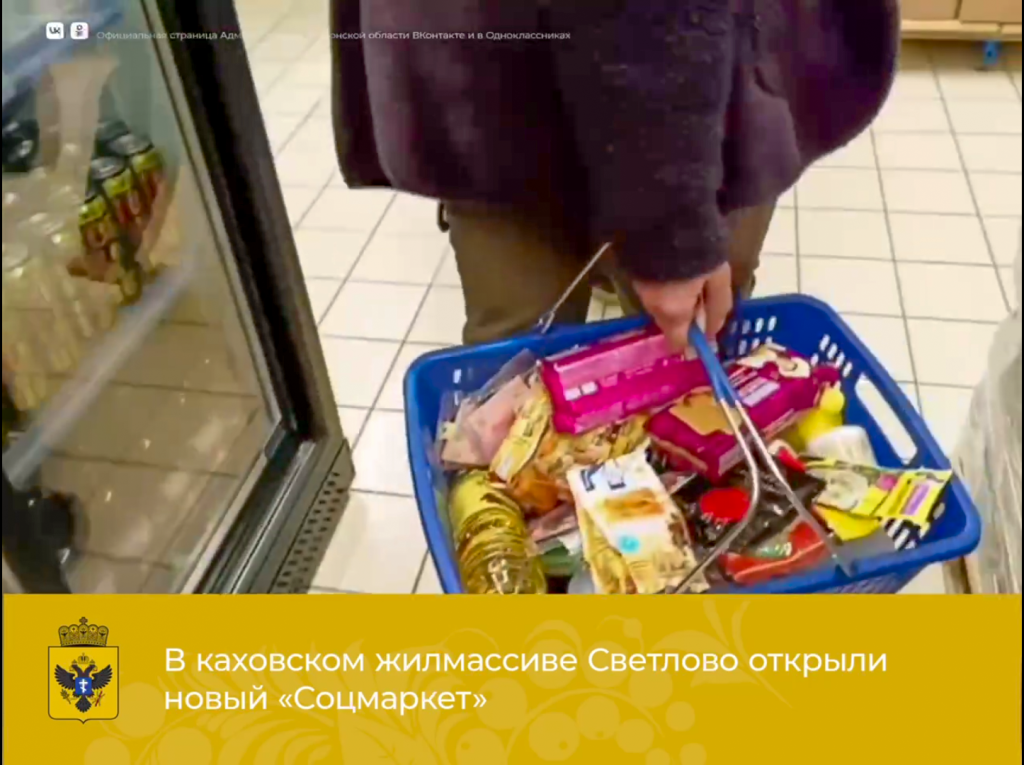 Магазин «Соцмаркет» відкрили в мікрорайоні Свєтлово окупованого росіянами міста Каховка в приміщенні, де раніше був магазин української мережі АТБ.Про це в Telegram повідомила окупаційна адміністрація Херсонської області.В повідомленні поплічники окупантів хвалять безіменних представників бізнесу (власники торгової мережі усіляко уникають публічності) за турботу про мешканців Каховки і за те що вони, як сказано в повідомленні, «не бояться в наш непростий час розміщувати свій капітал на території округу».