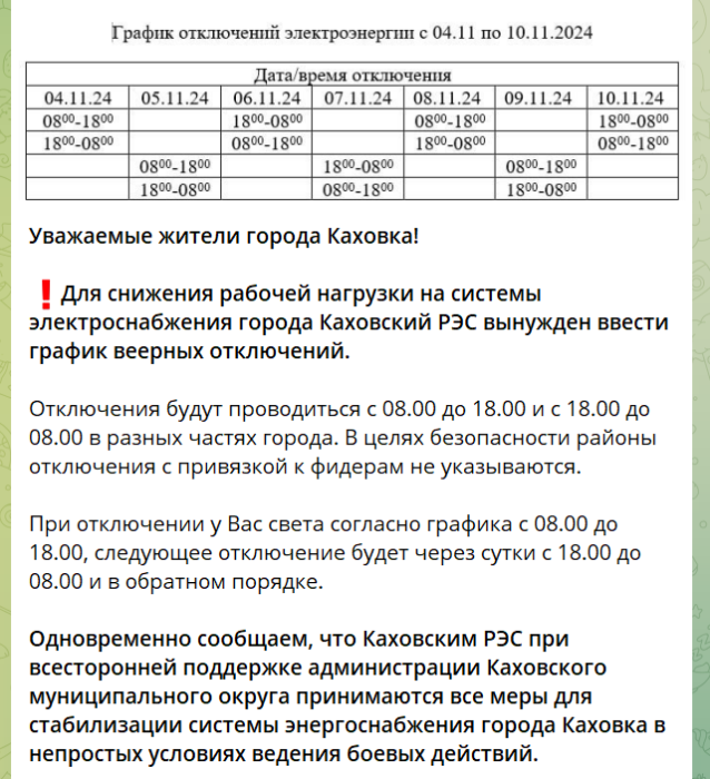 Наразі росіяни кажуть, що такі відключення — для зниження наванатаження на енергетичні системи. Графік відключень — внизу. Росіяни не зазначають локацій відключення «з міркувань безпеки», хоча небезпеку створюють самі.