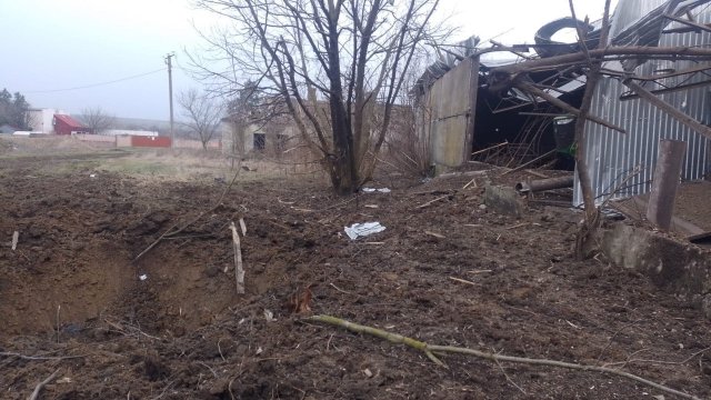 Ворожим вогнем знищено ангар. Також пошкоджено сільськогосподарську техніку: комбайн, оприскувач, чотири вантажні та один легковий автомобіль.