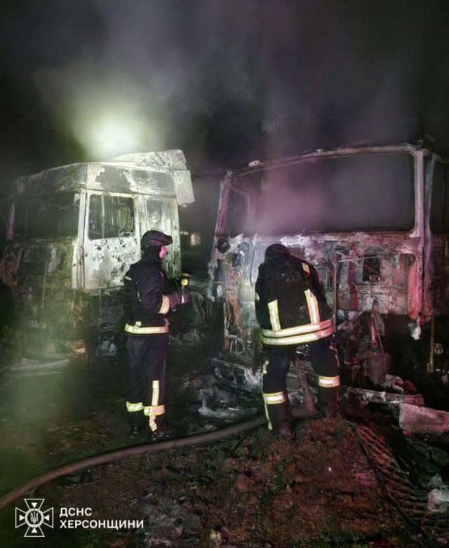Вночі, після ворожого обстрілу в передмісті Херсона, загорілось три вантажні автомобілі.