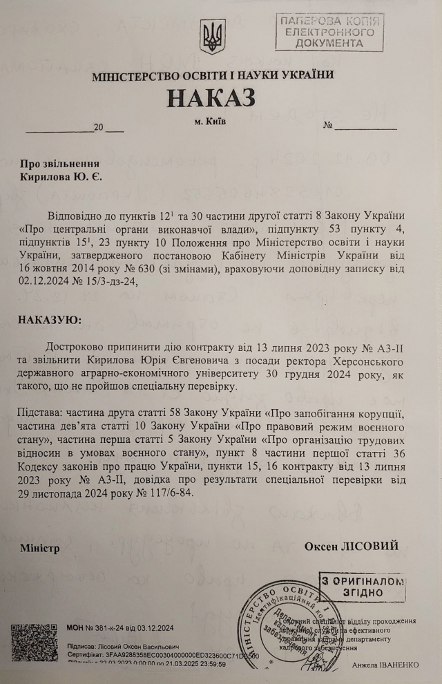 З ректором Херсонського державного аграрно-економічного університету Юрієм Кириловим Міністерство освіти та науки України достроково припинило контракт. Про це повідомляє «Антикорупційний вимір» із посиланням на сторінку Юрія Кирилова у Фейсбук. Не пройшов спеціальної перевірки?У соцмережі Кирилов виклав фото копії наказу та своєї відповіді-ознайомлення із таким супроводом: «Сьогодні ознайомився з наказом.