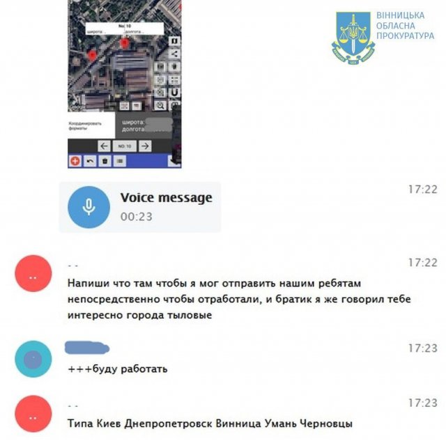 Попередньо встановлено, що підозрюваний передав куратору через месенджер близько трьох десятків повідомлень щодо розміщення військових об’єктів ЗСУ у різних містах України, телефонні контакти командирів підрозділів українських Сил оборони, адреси розташування ТЦК та телевеж, а також геолокації швартування цивільних кораблів у порту Одеси.