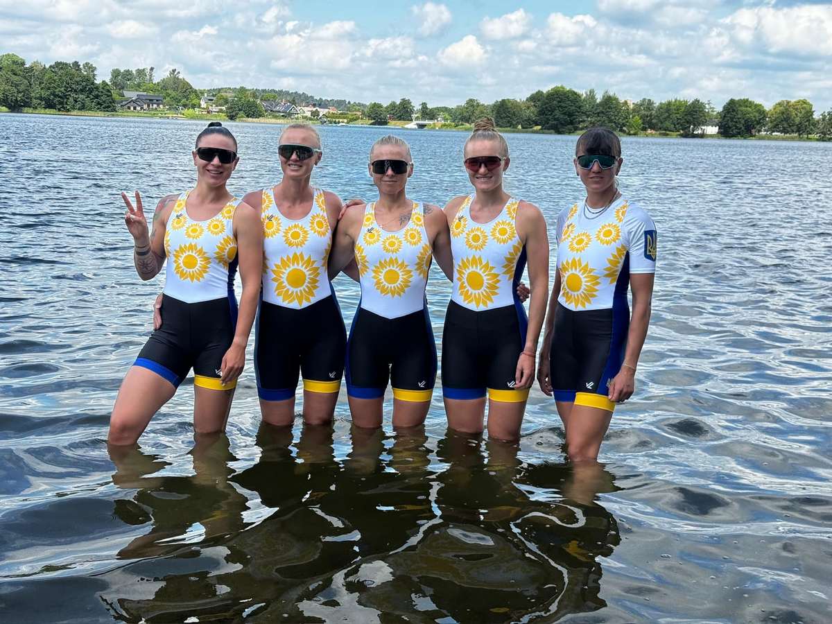 Одяг національної олімпійської жіночої збірної України з академічного веслування. На знімках – Дарина Верхогляд, Катерина Дудченко та Євгенія Довгодько разом із колежанками. Фото: фейсбук/Микола Чуприна